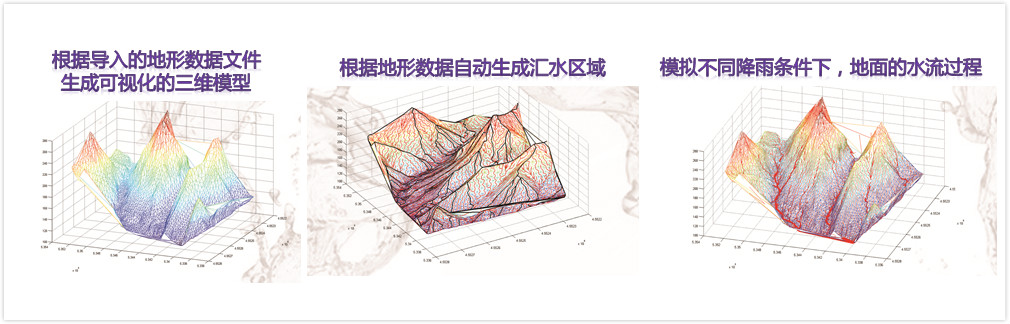 本系統(tǒng)應(yīng)用三維地理信息技術(shù),建立匯水區(qū)域自動(dòng)生產(chǎn)模型,充分考慮地面滲透、土地利用、地面粗糙程度等因素對(duì)地面水流流動(dòng)的影響,在數(shù)字化排水管網(wǎng)以及排水設(shè)施資料的基礎(chǔ)上,應(yīng)用水動(dòng)力學(xué)原理以及雨量排出平衡原理,結(jié)合氣象預(yù)報(bào)數(shù)據(jù),模擬不同降雨條件下城市地面以及排水管道徳水量和水位變化,達(dá)到給水預(yù)測(cè)的目的,對(duì)積水深度超過(guò)預(yù)警線(xiàn)的情況提供報(bào)警。