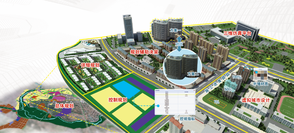 城市規(guī)劃管理系統(tǒng)利用三維地理信息平臺,結(jié)合規(guī)劃管理實際情況,通過將規(guī)劃相關(guān)空間信息和文檔信息緊密結(jié)合,形成集地理信息,辦公圖文信息、規(guī)劃信息等各種信息于一體的信息化平臺。該系統(tǒng)由規(guī)劃管理、規(guī)劃展示、規(guī)劃輔助決策、規(guī)劃檔案、規(guī)劃審批、虛擬城市設(shè)計、三維仿真平臺構(gòu)成。各模塊既可以相互獨立又可以有機的集成在一起,構(gòu)成了全面的規(guī)劃管理信息化建設(shè)解決方案。